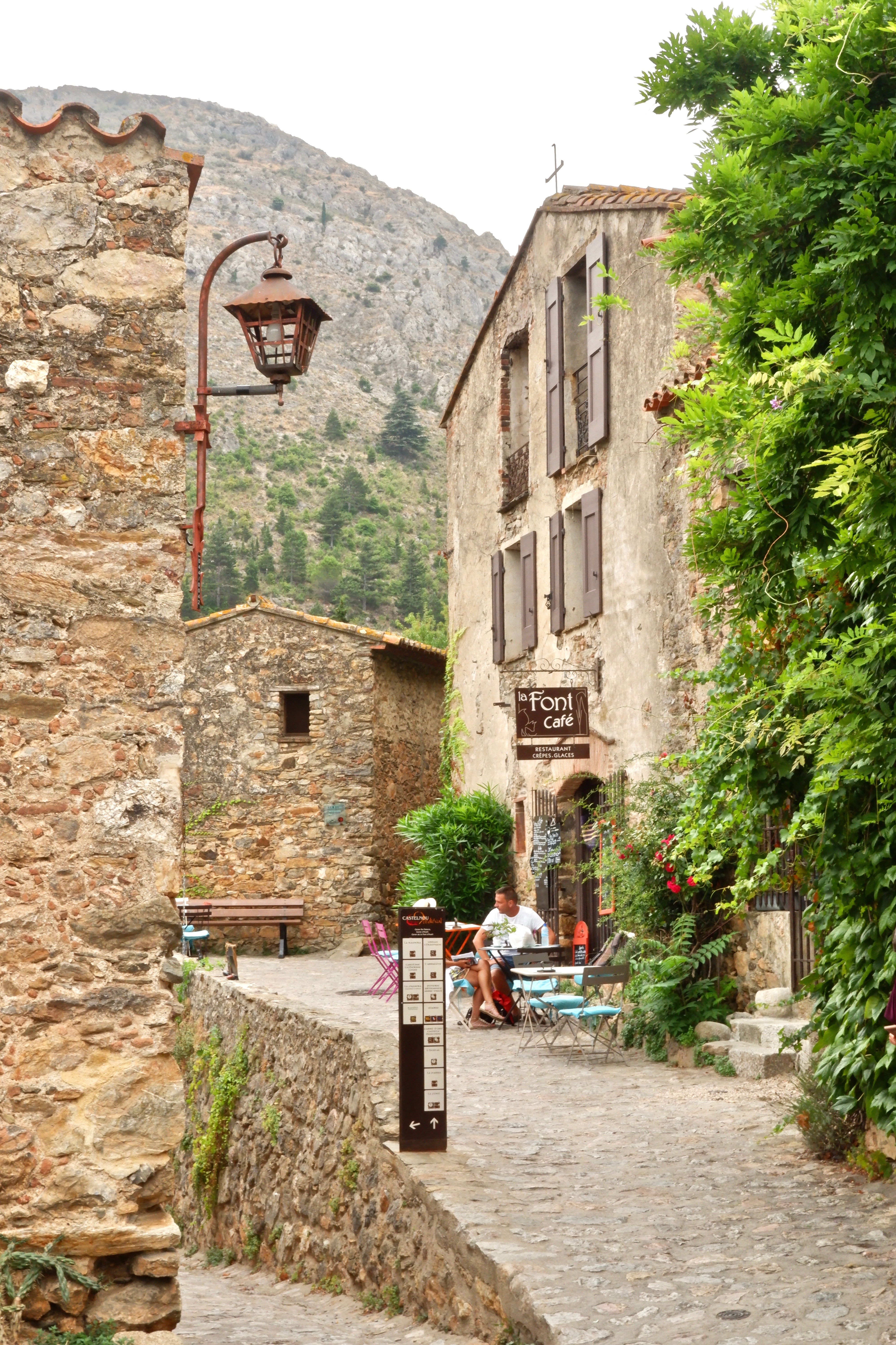 Considering the number of visitors arriving in the village at lunchtime, we decided to have a quite early lunch break at the Font Café (first street on the left when passing by Castelnou’smain gate). Their terrasse tables are located on a street with no pedestrians and came with an extra shot of sun! Their summer salads and daily specials were delicious: I personally had their honey goat cheese salad which I loved!